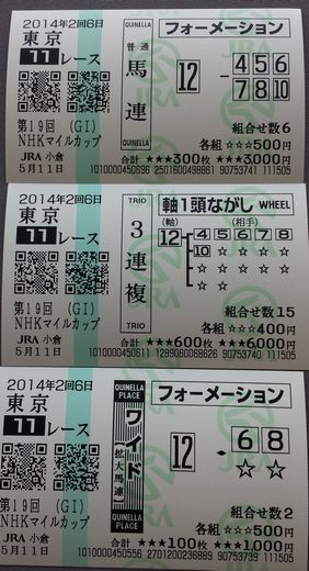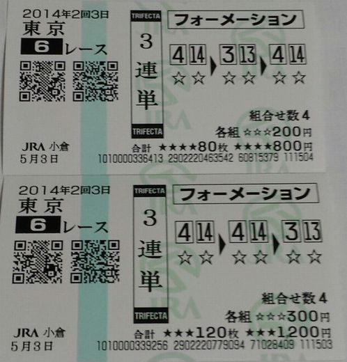 こんにちは。 今日の初当たりは東京6R 20140503_東京6R 今日の重賞馬券 (1) 東京(土) 11R 3連単 軸2頭ながしマルチ 軸馬:05,10 相手:02,03,06 各100円(計1,800円) (2) 東京(土) 11R 3連複 軸2頭ながし 軸馬:05-10 相手:02,03,06 各400円(計1,200円) 合計 3,000円 今日も素適な1日となりますように ブログランキングに参加しています。 記事にビビっときたらワンクリックお願いします!♪