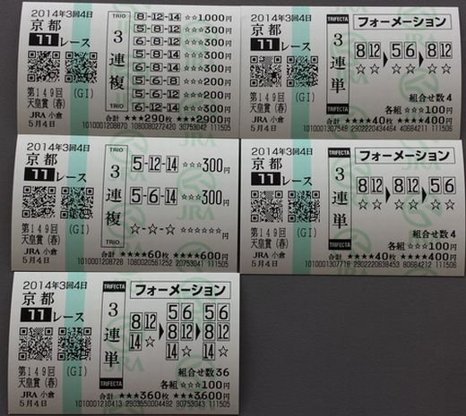おはようございます。 小倉は晴れています。 今日の重賞馬券 (1) 京都(土) 11R 3連単 軸2頭ながしマルチ 軸馬:05,14相手:02,06,08 各100円(計1,800円) (2) 京都(土) 11R 3連複 軸2頭ながし 軸馬:05-14相手:02,06,08 各400円(計1,200円) 合計 3,000円 先週の天皇賞外れ馬券 今日も素適な1日となりますように ブログランキングに参加しています。 記事にビビっときたらワンクリックお願いします!♪