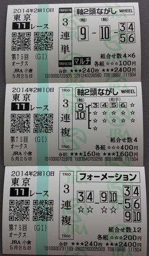 おはようございます。 今日の小倉は、雨後晴 26℃[-3]20℃[+2] 久しぶりにG1馬券が当たりました (1) 東京(日) 11R 3連単 軸2頭ながしマルチ 軸馬:10,09相手:03,04,05,06各100円(計2,400円) 的中 (2) 東京(日) 11R 3連複 軸2頭ながし 軸馬:09-10 相手:03,04,05,06各400円(計1,600円) 的中 (3) 東京(日) 11R ワイド ながし 軸馬:04相手:03,05,06 各300円(計900円) (4) 東京(日) 11R 馬 単 軸1頭ながしマルチ 軸馬:04 相手:03,05,06,09,10 各100円(計1,000円) (5) 東京(日) 11R 3連複 フォーメーション 馬1:03,04馬2:09,10馬3:03,04,05,06,09,10 各200円(計2,400円) (6) 東京(日) 11R ワイド ながし 軸馬:04相手:09,10 各500円(計1,000円) (7) 東京(日) 11R 単 勝 04 200円 購入金額 9,500円 払戻金額 18,970円 オークス当たり馬券 オークス夢馬券 (外れ) 今日も素適な1日となりますように ブログランキングに参加しています。 記事にビビっときたらワンクリックお願いします!♪