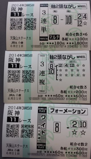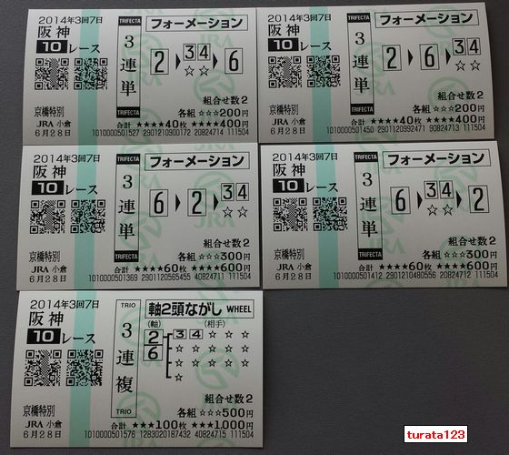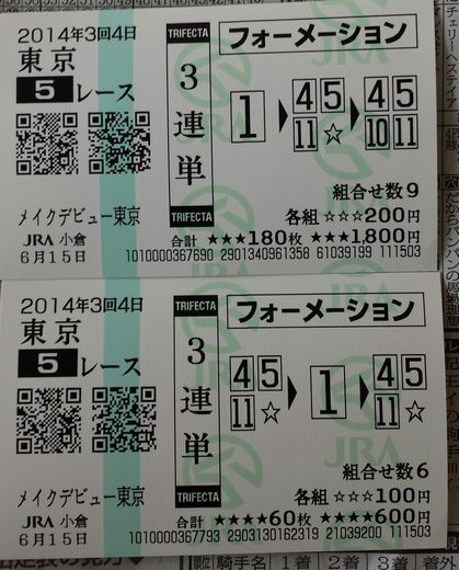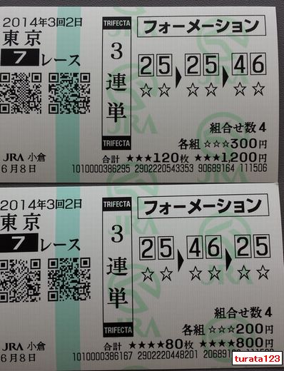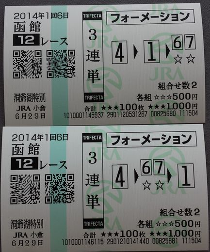 こんばんは。日曜日のタラレバ馬券(函館12R ハナ差で届かず) 1番人気から勝負しましたが外れました。 20140629_函館12R外れ馬券 01 函館 日 12R 3連単フォーメーション 1着:04 2着:01 3着:06,07 各 500円計1,000円 - - 0円 02 函館 日 12R 3連単フォーメーション 1着:04 2着:06,07 3着:01 各 500円計1,000円 - - 0円 合計 2,000円 0円 3連単 04-07-01 3800円 当たれば38000円の配当でした。 01 函館 日 10R 3連単フォーメーション 1着:06,07 2着:03,06,07,10 3着:03,06,07,10 各 100円計1,200円 - - 0円 02 函館 日 10R 3連複BOX 03,06,07,10 各200円計800円 03-06-10 2,630円 5,260円 合計 2,000円 5,260円 明日も素適な1日となりますように ブログランキングに参加しています。 記事にビビっときたらワンクリックお願いします!♪