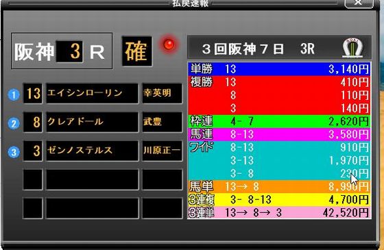 おはようございます。小倉は曇後晴 曇時々雨 28℃[+2]21℃[0] 今日の初当たりは阪神3R Nスポーツの鎌田記者の俺の秘密兵器が参考に当たりました。 (1) 阪神(土) 3R ワイド ながし 軸馬:13相手:08,16 各400円(計800円) 的中 (2) 阪神(土) 3R 3連複 フォーメーション 馬1:08馬2:13,16馬3:03,04,13,16 各400円(計2,000円) 的中 購入金額 2,800円 払戻金額 22,440円 今日も素適な1日となりますように ブログランキングに参加しています。 記事にビビっときたらワンクリックお願いします!♪