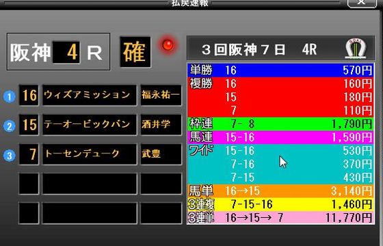 こんばんは。今日の初当たりは阪神11R (1) 阪神(土) 11R 3連単 軸2頭ながしマルチ 軸馬:08,10相手:02,04,12 各100円(計1,800円) 的中 (2) 阪神(土) 11R ワイド 08-10 200円 的中 購入金額 2,000円 払戻金額 9,050円 (1) 東京(土) 12R 3連単 フォーメーション 1着:02,162着:02,06,11,163着:02,06,11,16 各100円(計1,200円) 的中 (2) 東京(土) 12R 3連単 フォーメーション 1着:162着:023着:06,11 各200円(計400円) 的中 (3) 東京(土) 12R 3連単 フォーメーション 1着:162着:06,113着:02 各200円(計400円) (4) 東京(土) 12R 3連複 軸1頭ながし 軸馬:16相手:02,06,11 各400円(計1,200円) 的中 購入金額 3,200円 払戻金額 11,660円 明日も素適な1日となりますように ブログランキングに参加しています。 記事にビビっときたらワンクリックお願いします!♪