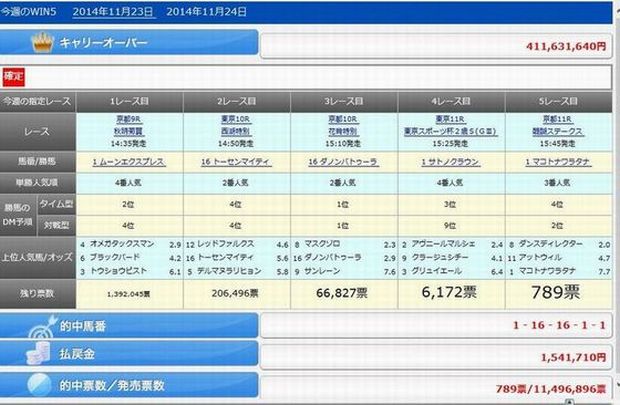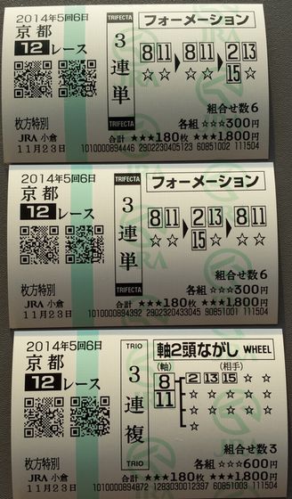 こんばんは 小倉は晴れ 20℃[0]9℃[-2] 明日の軍資金ができました。マイルチャンピオンシップが当たって、最終レース(京都12R)が当たり 20141123_京都12R当たり馬券 (1) 京都(日) 12R 3連単 フォーメーション 1着:08,112着:08,113着:02,13,15 各300円(計1,800円) 的中(2) 京都(日) 12R 3連単 フォーメーション 1着:08,112着:02,13,153着:08,11 各300円(計1,800円) (3) 京都(日) 12R 3連複 軸2頭ながし 軸馬:08-11相手:02,13,15各500円(計1,500円) 的中購入金額 5,100円 払戻金額 21,400円 20141123_マイルチャンピオンシップ当たり馬券 (1) 京都(日) 11R 3連単 軸2頭ながしマルチ 軸馬:12,08相手:07,09,13,14各100円(計2,400円) (2) 京都(日) 11R 3連複 軸2頭ながし 軸馬:08-12相手:07,09,13,14各400円(計1,600円) (3) 京都(日) 11R 馬 連 ながし 軸馬:12相手:07,08,09,13,14 各400円(計2,000円) 中購入金額 6,000円 払戻金額 15,560円 明日のレースに張る資金ができました。 今日のWIN5は、全員外れ、4.1億円がキャリーオーバー 明日も素適な1日となりますように ブログランキングに参加しています。 記事にビビっときたらワンクリックお願いします!♪