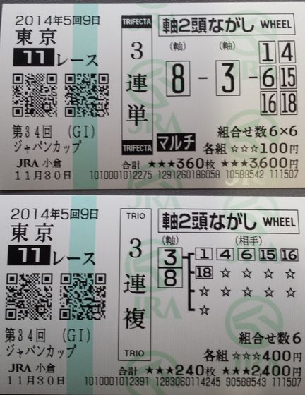 おはようございます。 小倉は曇後雨 18℃[0] 13℃[+2] ジャパンカップ外れ馬券 馬連(1)(4)は4120円、馬単(4)(1)は7800円、3連複(1)(4)(15)は1万9750円、3連単(4)(1)(15)は9万1790円。ヒモに選んだ3頭で決まり。今日も素適な1日となりますように ブログランキングに参加しています。 記事にビビっときたらワンクリックお願いします!♪
