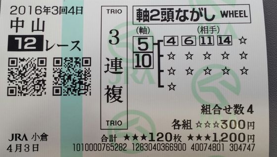 こんばんは。 小倉は雨後曇り 阪神12Rの当たり馬券が外れ馬券に 阪神12Rが中山12Rになっていました。 購入後の確認もれでした。 IPATは当たっていたのに 01 阪神 日 12R 3連複軸2頭ながし 軸:05,10 04,06,11,14 各 300円計1,200円 05-06-10 1,940円 5,820円 表示 合計 1,200円 5,820円 阪神11Rの当たり馬券 01 阪神 日 11R 3連複軸1頭ながし 軸:07 02,03,08,09 各 200円計1,200円 07-08-09 2,540円 5,080円 表示 合計 1,200円 5,080円 今週はしっかり当てたいですね! 今日も素適な1日となりますように ブログランキングに参加しています 記事にビビっときたらワンクリックお願いします!♪!!アダルトトラックバックやコメントはやめてください!!