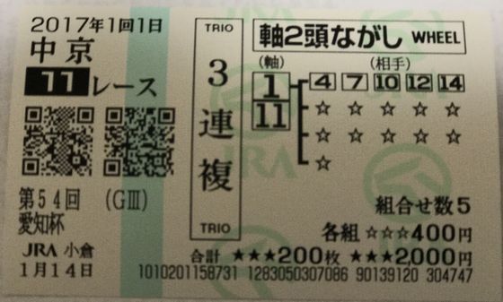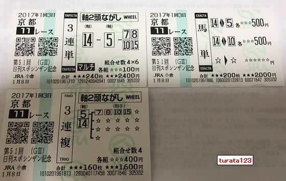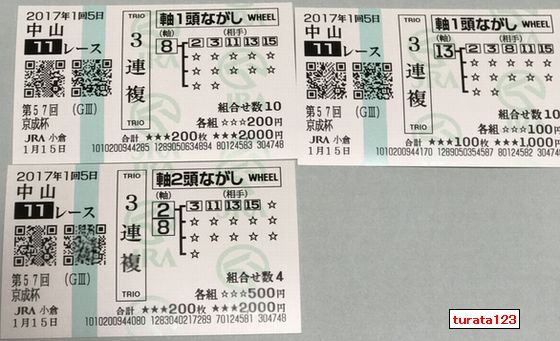 こんにちは。 小倉は曇り 中山競馬の京成杯の3連複が当たりました。 (1) 中山(日) 11R 3連複 軸1頭ながし 軸馬:08相手:02,03,11,13,15 各200円(計2,000円)的中(2) 中山(日) 11R 3連複 軸1頭ながし 軸馬:13相手:02,03,08,11,15 各100円(計1,000円) (3) 中山(日) 11R 3連複 軸2頭ながし 軸馬:02-08相手:03,11,13,15各500円(計2,000円)的中購入金額 5,000円 払戻金額 32,620円 明後日の日経新春杯も当てたいですね! 馬券の資金は豊富です。 ブログランキングに参加しています。 記事にビビっときたらワンクリックお願いします!♪&l