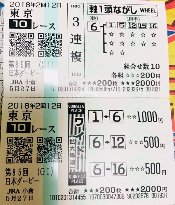 昨日のダービーは大波乱 3連複 52万1600円福永祐一騎手(41)騎乗の5番人気ワグネリアン(牡、友道)が、平成最後のダービー馬に輝いた。勝ち時計は2分23秒6。半馬身差2着に4番人気エポカドーロ、3着は16番人気コズミックフォース。福永騎手はダービー初勝利、友道康夫調教師は16年マカヒキに続き2勝目。馬連(12)(17)7950円、23番人気馬単(17)(12)1万5520円、49番人気3連複(7)(12)(17)52万1600円、453番人気3連単(17)(12)(7)285万6300円。2229番人気今日のダービー馬券は、青葉賞馬からの3連腹とワイド馬券です。今日も素適な1日となりますように 記事にビビっときたらワンクリックお願いします!♪!!アダルトトラックバックやコメントはやめてください!!