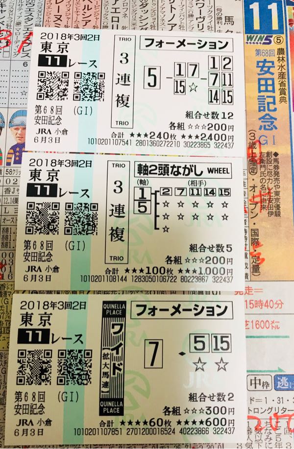 おはようございます。昨日は馬券が連続的中しました。東京12Rの3連複が当たりました。1番人気で870円の配当を700円購入。この日はIPATは6340円プラスとなりました。場外馬券は4230円プラスで、安田記念の軍資金ができました。しっかりと予想したいですね!今日も素適な1日となりますように 記事にビビっときたらワンクリックお願いします!♪!!アダルトトラックバックやコメントはやめてください!!