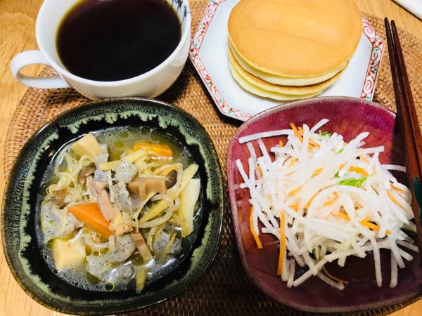 おはようございます😃小倉は曇り☁️時々雨☂️です。今日の朝食はパンケーキ、筑前煮、カットダイコンサラダ、蜂蜜入りコーヒーでした。筑前煮は、圧力鍋で作りました。オリーブオイルを使って鶏肉と黒豆もやしを炒め、国産ちくぜん煮の具、ごぼう、糸こんにゃく、コンニャクにだし汁とかつお風味のだし汁を加えて炊きました。私の好きな料理です。今日も素適な1日となりますように 記事にビビっときたらワンクリックお願いします!♪!!アダルトトラックバックやコメントはやめてください!!