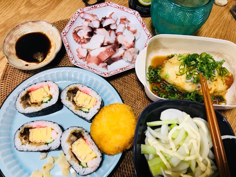こんばんは、小倉は星明かりです。今日の家呑みは、先日買ったタコの刺身、半額で買った巻き寿司、豆腐の魚ロッケ、しらすと細ねぎをトッピングした揚げ出しとうふ、タマネギとキュウリの酢の物とレモン酎ハイでした。素敵な木曜日となりますように記事にビビっときたらワンクリックお願いします!♪!!アダルトトラックバックやコメントはやめてください!!