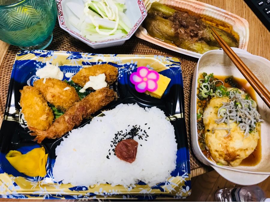 こんばんは、小倉は星明かりです。サンリブに入店したのが20時過ぎなので、半額商品を購入しました。今日の夕食は、カキフライ弁当🍱と焼き茄子、揚げ出しとうふにしらす、細ねぎをトッピングして、タマネギとキュウリの酢の物とレモン🍋入りレモン酎ハイでいただきました。素敵な水曜日となりますように記事にビビっときたらワンクリックお願いします!♪!!アダルトトラックバックやコメントはやめてください!!