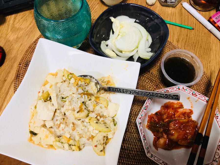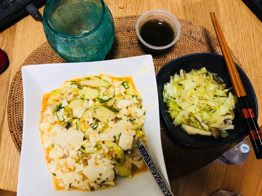 こんばんは、小倉は小雨です。今日の夕食は、茄子🍆とキムチをトッピングした麻婆豆腐丼、キャベツともやしとしめじの炒め物、黒須もずくとレモン酎ハイでした。素敵な土曜日となりますように記事にビビっときたらワンクリックお願いします!♪!!アダルトトラックバックやコメントはやめてください!!