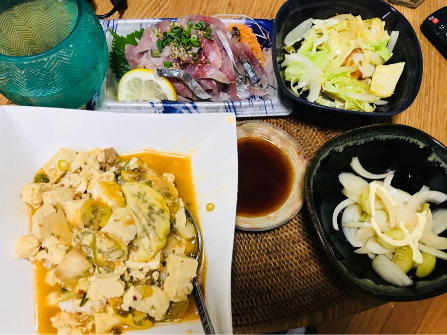 こんばんは、小倉は曇り☁️です。今日の夕食は、トライアルで買ったあじのたたき、麻婆豆腐丼、タマネギとキュウリの酢の物、タマネギとキャベツと竹輪のオリーブ炒めとレモン酎ハイでした。素敵な月曜日となりますように記事にビビっときたらワンクリックお願いします!♪!!アダルトトラックバックやコメントはやめてください!!