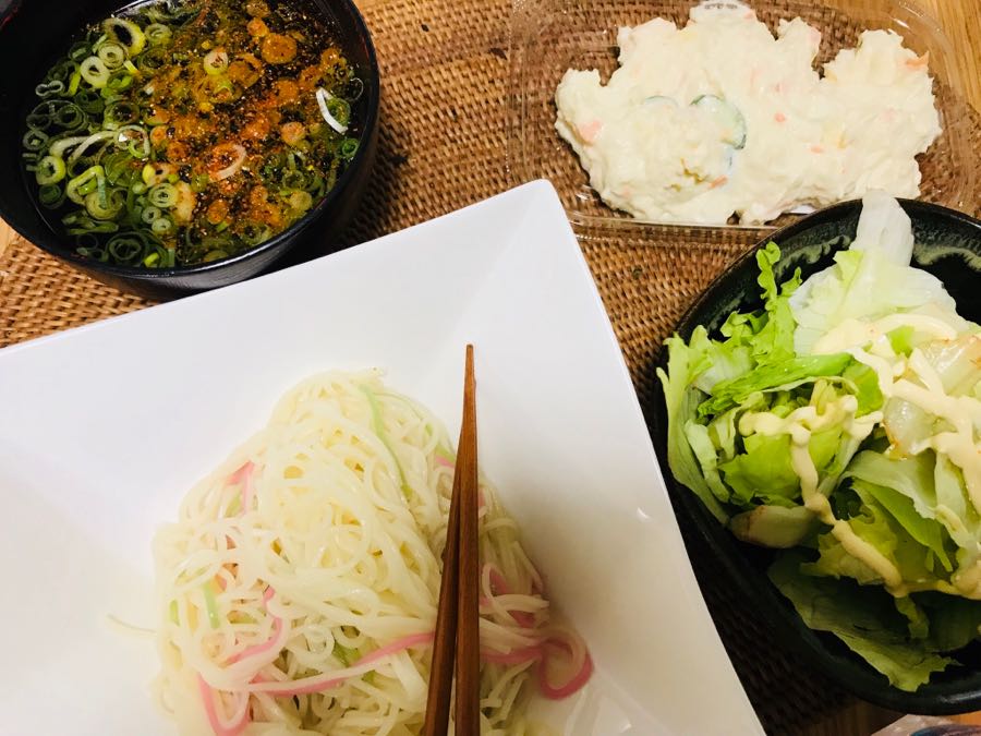 こんにちは😃小倉は曇り☁️です。今日の昼食は、トライアルで買ったポテトサラダと冷麦とレタスのサラダでした。細ねぎと七味をたっぷり入れていただきました。素敵な月曜日となりますように記事にビビっときたらワンクリックお願いします!♪!!アダルトトラックバックやコメントはやめてください!!