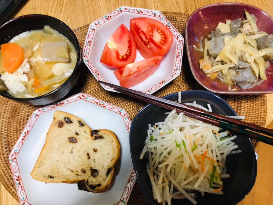 おはようございます😃小倉は曇り☁️のち晴れです今日の朝食は、レーズンパン、卵🥚入り味噌汁、筑前煮、トマト、カットダイコンサラダでした。素敵な木曜日となりますように記事にビビっときたらワンクリックお願いします!♪!!アダルトトラックバックやコメントはやめてください!!