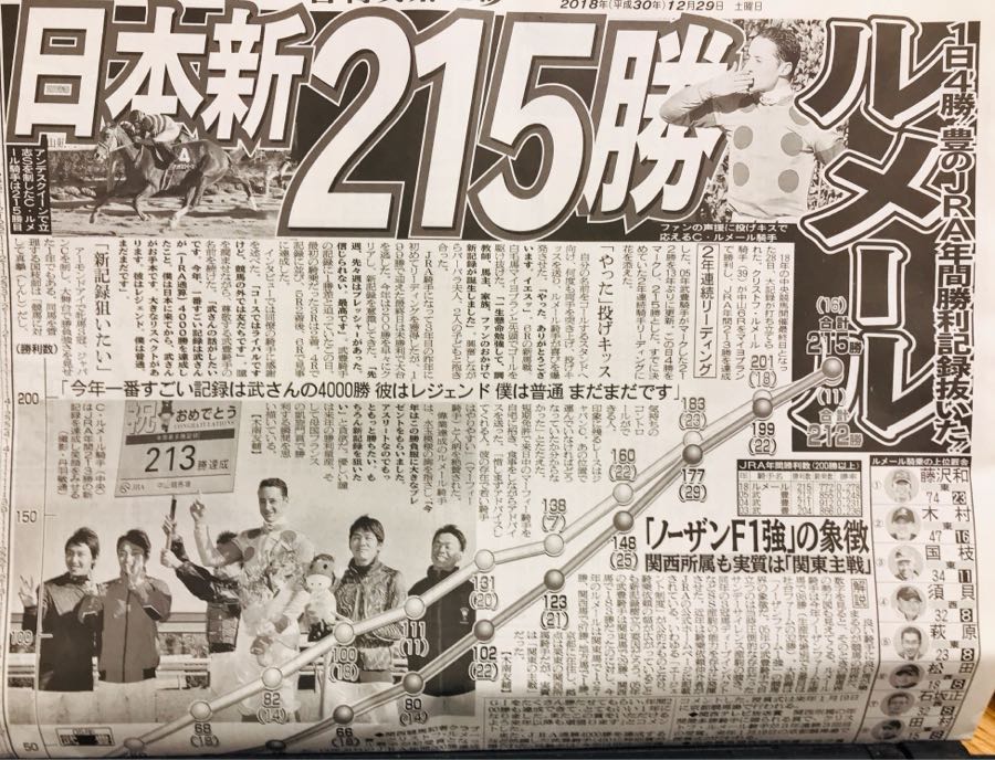 こんにちは、小倉は曇り☁️です。 ルメール騎手が1日4勝し、武豊騎手のJRA年間勝利記録を塗り替え215勝した。