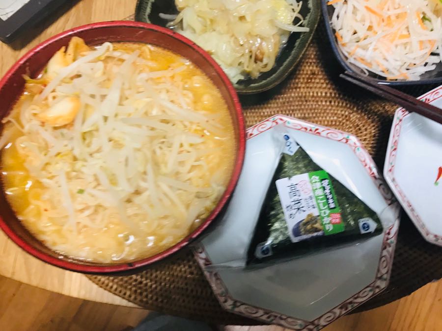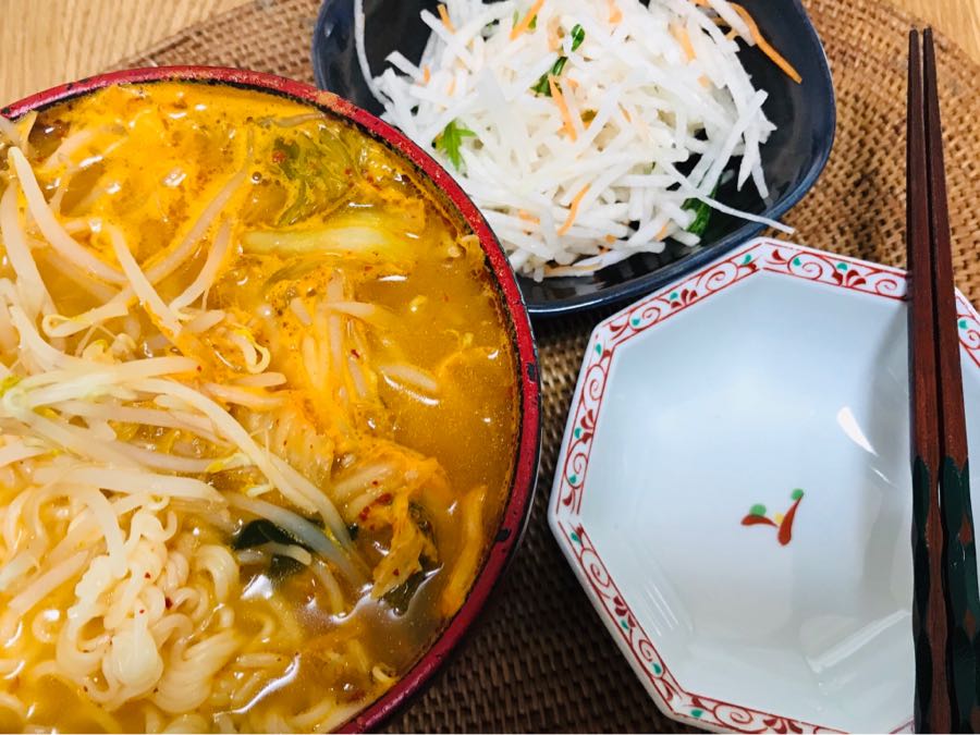 こんにちは、小倉は曇り☁️です。今日の昼食は、もやしと白菜キムチをトッピングした豚骨らーめん、高菜おにぎり、キャベツと玉ねぎともやしと鯛ちくわをオリーブ油で炒めた煮物、カットダイコンサラダでした。素敵な土曜日となりますように 記事にビビっときたらワンクリックお願いします!♪!!アダルトトラックバックやコメントはやめてください!!