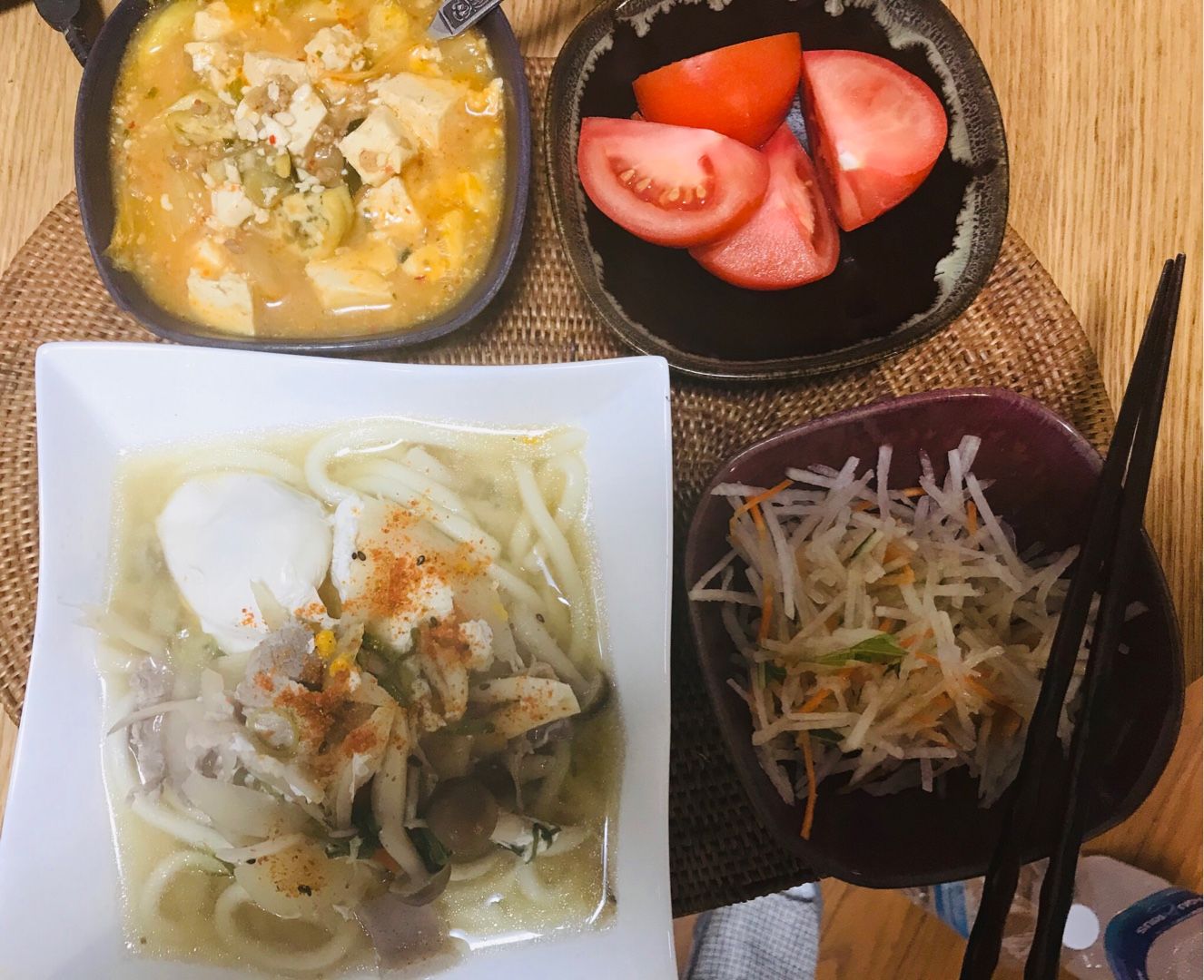おはようございます😃小倉は晴れ時々曇りです。月曜日の朝食は、卵🥚入り豚汁風煮込みうどん、麻婆豆腐、トマト、カットダイコンサラダでした。今週も宜しくお願いします。 今日も素適な月曜日となりますように ブログランキングに参加しています。 記事にビビっときたらワンクリックお願いします!♪!!アダルトトラックバックやコメントはやめてください!!