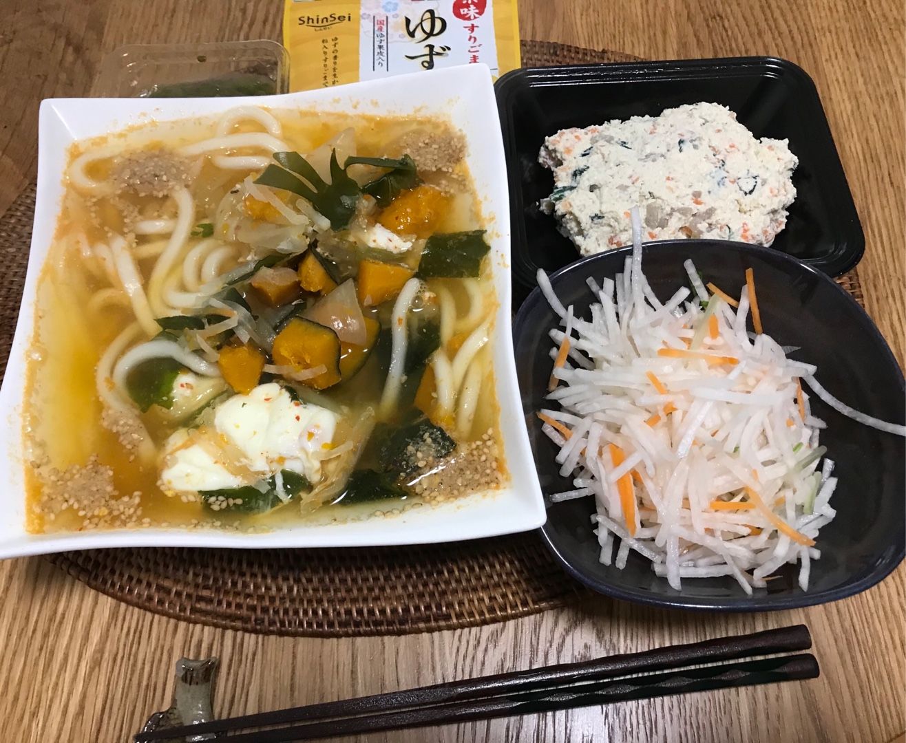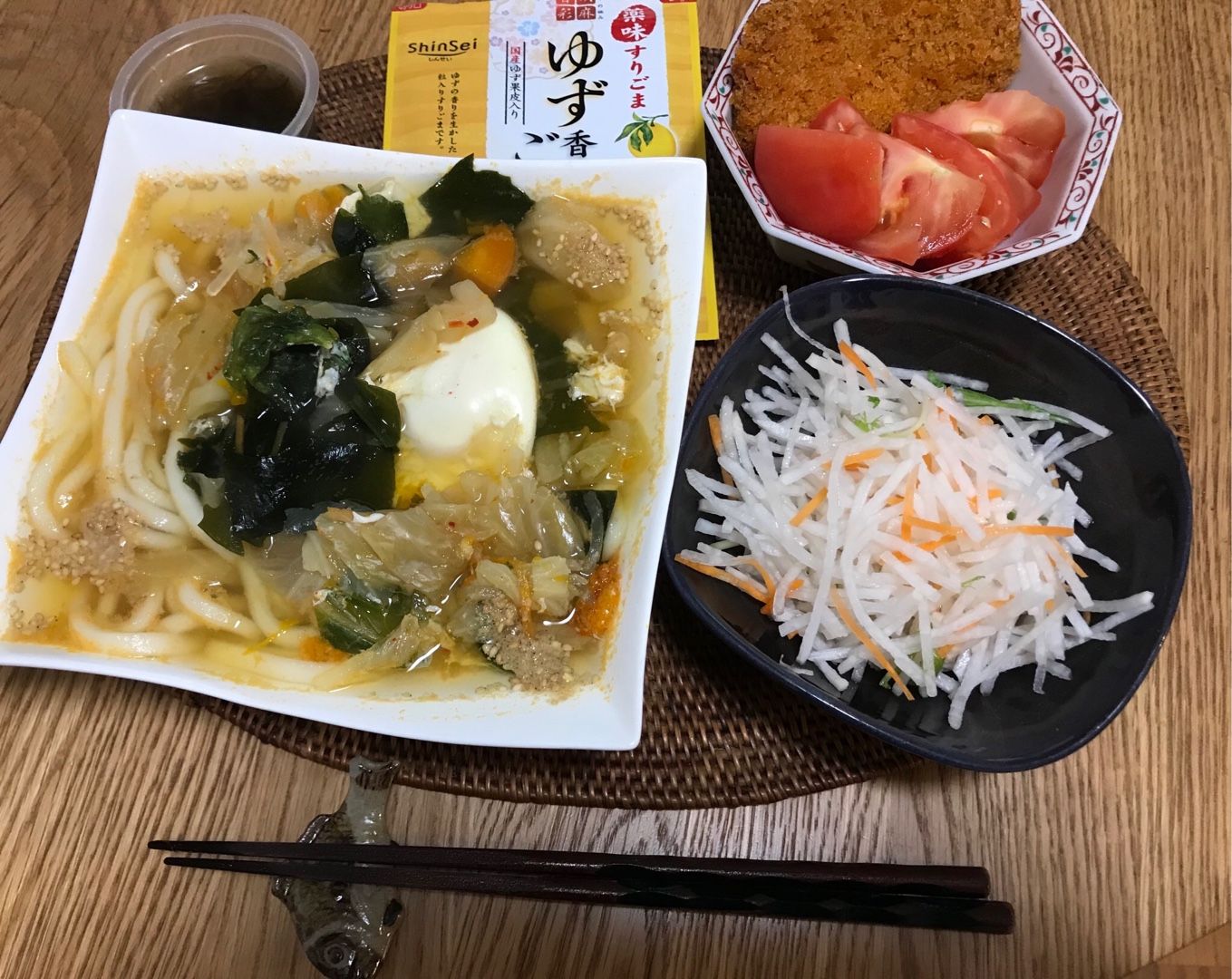 こんにちは😃小倉は曇り☁️です。日曜日の昼食は、わかめとカットダイコンと卵🥚と白菜キムチをトッピングした野菜スープ煮込みうどんをゆず香るごまの風味で、白和え、カットダイコンサラダ、うすあさめかぶでした。素敵な日曜日となりますように 記事にビビっときたらワンクリックお願いします!♪!!アダルトトラックバックやコメントはやめてください!!