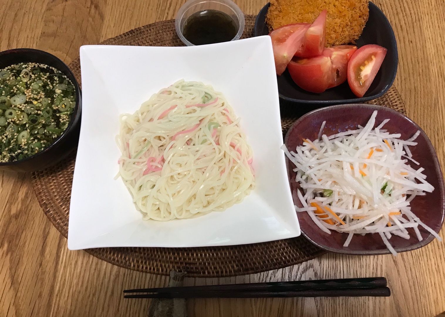 こんにちは😃小倉は晴れています。火曜日の昼食は、田舎ひやむぎを薬味で、カレー味ギョロッケ、トマト🍅、カットダイコンサラダ、黒酢もずくでした。薬味は、細ねぎとおろししょうがとゆず香るごまをおいがつおつゆで素敵な火曜日となりますように 記事にビビっときたらワンクリックお願いします!♪!!アダルトトラックバックやコメントはやめてください!!