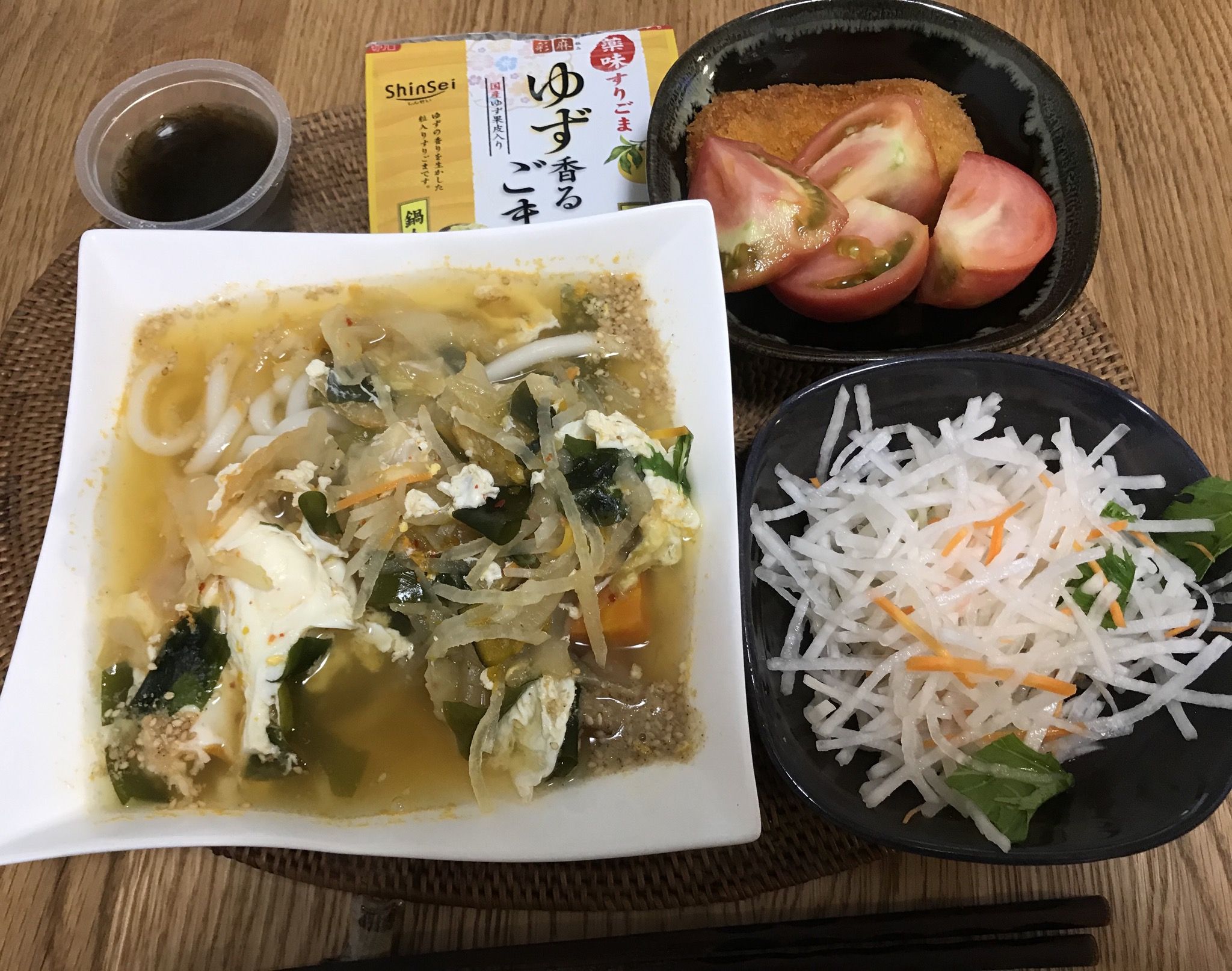 おはようございます😃水曜日の朝食は、わかめと大根と白菜キムチをトッピングした野菜スープ煮込みうどんをゆず香る胡麻の風味でカレー味ギョロッケ、トマト、大根サラダ、黒酢もずくでした。素敵な水曜日となりますように 記事にビビっときたらワンクリックお願いします!♪!!アダルトトラックバックやコメントはやめてください!!