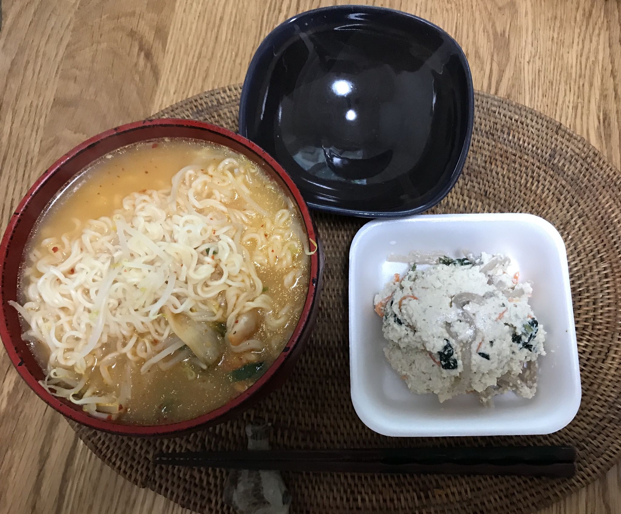 こんにちは。水曜日の昼食は、黒豆もやしと白菜キムチをトッピングした豚骨ラーメン、豆腐屋の白和えでした。インスタントラーメンはうまかっちゃん素敵な水曜日となりますように 記事にビビっときたらワンクリックお願いします!♪!!アダルトトラックバックやコメントはやめてください!!
