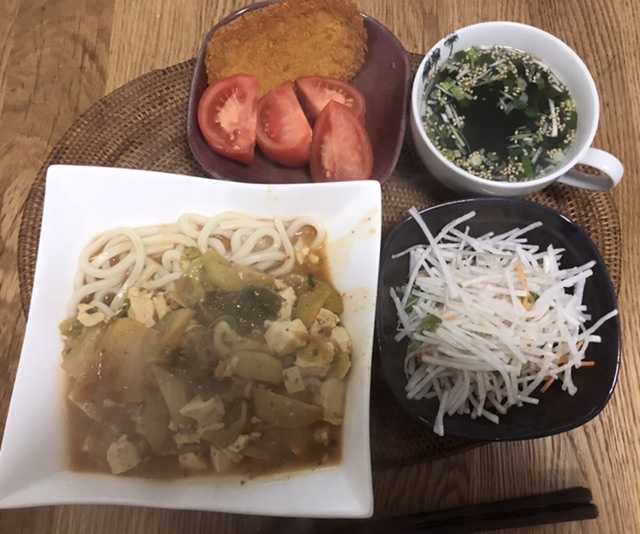 こんにちは。木曜日の昼食は、茄子と白菜キムチをトッピングした麻婆豆腐うどん、カレー味ギョロッケ、トマト、大根サラダとしじみわかめスープでした。素敵な木曜日となりますように 記事にビビっときたらワンクリックお願いします!♪!!アダルトトラックバックやコメントはやめてください!!