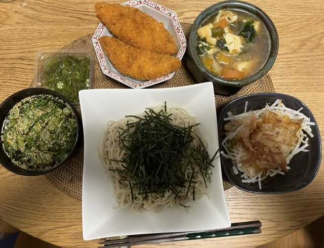 こんばんは火曜日の夕食は、刻みのりつき更科生そばを薬味で白身魚のフライ、おくらめかぶ、花かつお大根サラダ、わかめと京がんもと卵入り味噌野菜スープでした。今月9日目の休肝日でした。薬味は、細ネギとおろししょうが、ゆず香るごまを追いがつおつゆで素敵な火曜日となりますように 記事にビビっときたらワンクリックお願いします!♪!!アダルトトラックバックやコメントはやめてください!!