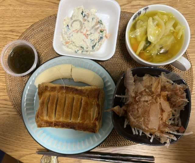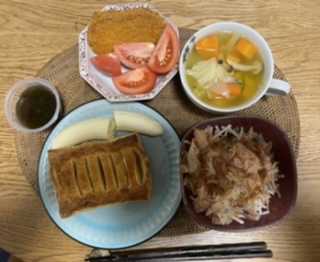 おはようございます😃木曜日の朝食は、アップルパイ、バナナ、カレー味ギョロッケ、トマト、花かつお大根サラダ黒酢もずくと野菜スープでした。素敵な木曜日となりますように 記事にビビっときたらワンクリックお願いします!♪!!アダルトトラックバックやコメントはやめてください!!