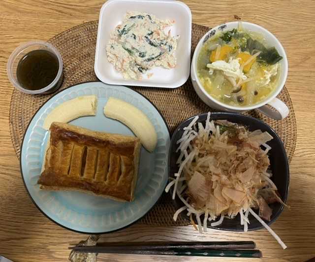 おはようございます😃水曜日の朝食は、アップルパイ、バナナ、しらあえ、花かつお大根サラダ黒酢もずくとわかめと大根と卵入り味噌野菜スープでした。素敵な水曜日となりますように 記事にビビっときたらワンクリックお願いします!♪!!アダルトトラックバックやコメントはやめてください!!