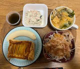 おはようございます😃月曜日の朝食は、アップルパイ、バナナ、しらあえ、花かつお大根サラダ、黒酢もずくわかめ・しいたけ・大根・玉子入り味噌野菜スープでした。素敵な月曜日となりますよう 記事にビビっときたらワンクリックお願いします!♪!!アダルトトラックバックやコメントはやめてください!!