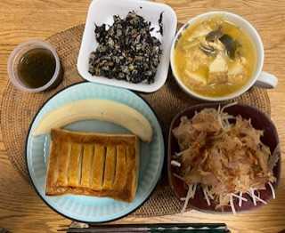 おはようございます😃火曜日の朝食は、アップルパイ、バナナ、ひじき炒め、花かつお大根サラダ、黒酢もずくわかめ・しいたけ・大根・玉子入り味噌野菜スープでした。素敵な火曜日となりますよう 記事にビビっときたらワンクリックお願いします!♪!!アダルトトラックバックやコメントはやめてください!!