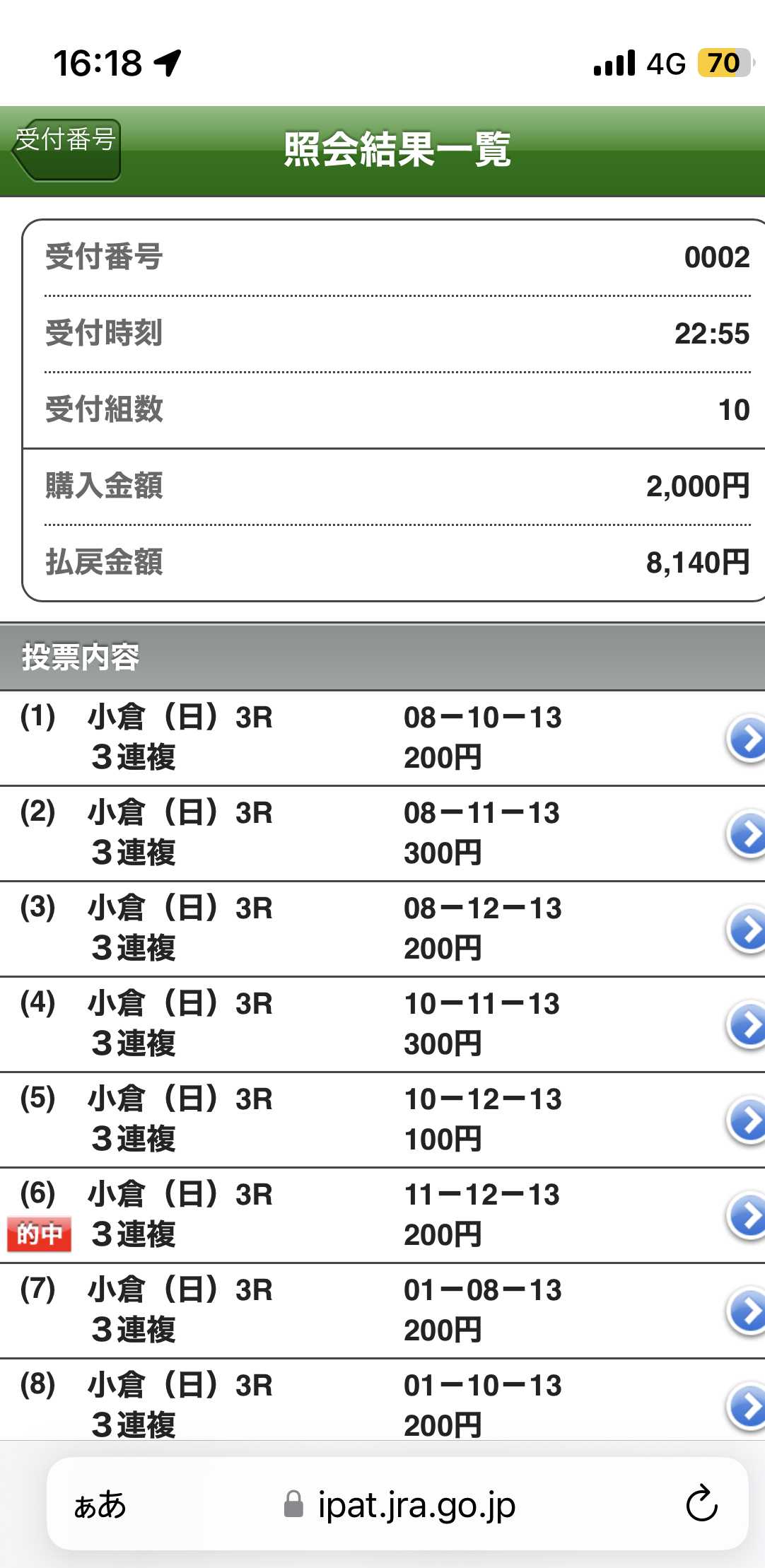 こんばんは😃小倉3R 3連複馬券が当たりました4番人気から10点で当たり2000円で8140円戻り素敵な日曜日となりますように 記事にビビっときたらワンクリックお願いします!♪!!アダルトトラックバックやコメントはやめてください!!
