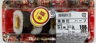こんばんはサンリブ守恒店の見切り品は、半額の巻き寿司 ハーフでした。これで家飲みします。素敵な火曜日となりますように 記事にビビっときたらワンクリックお願いします!♪!!アダルトトラックバックやコメントはやめてください!!