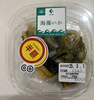 こんばんはサンリブ守恒店の見切り品は、半額の海藻いかでした素敵な木曜日となりますように記事にビビっときたらワンクリックお願いします!♪!!アダルトトラックバックやコメントはやめてください!