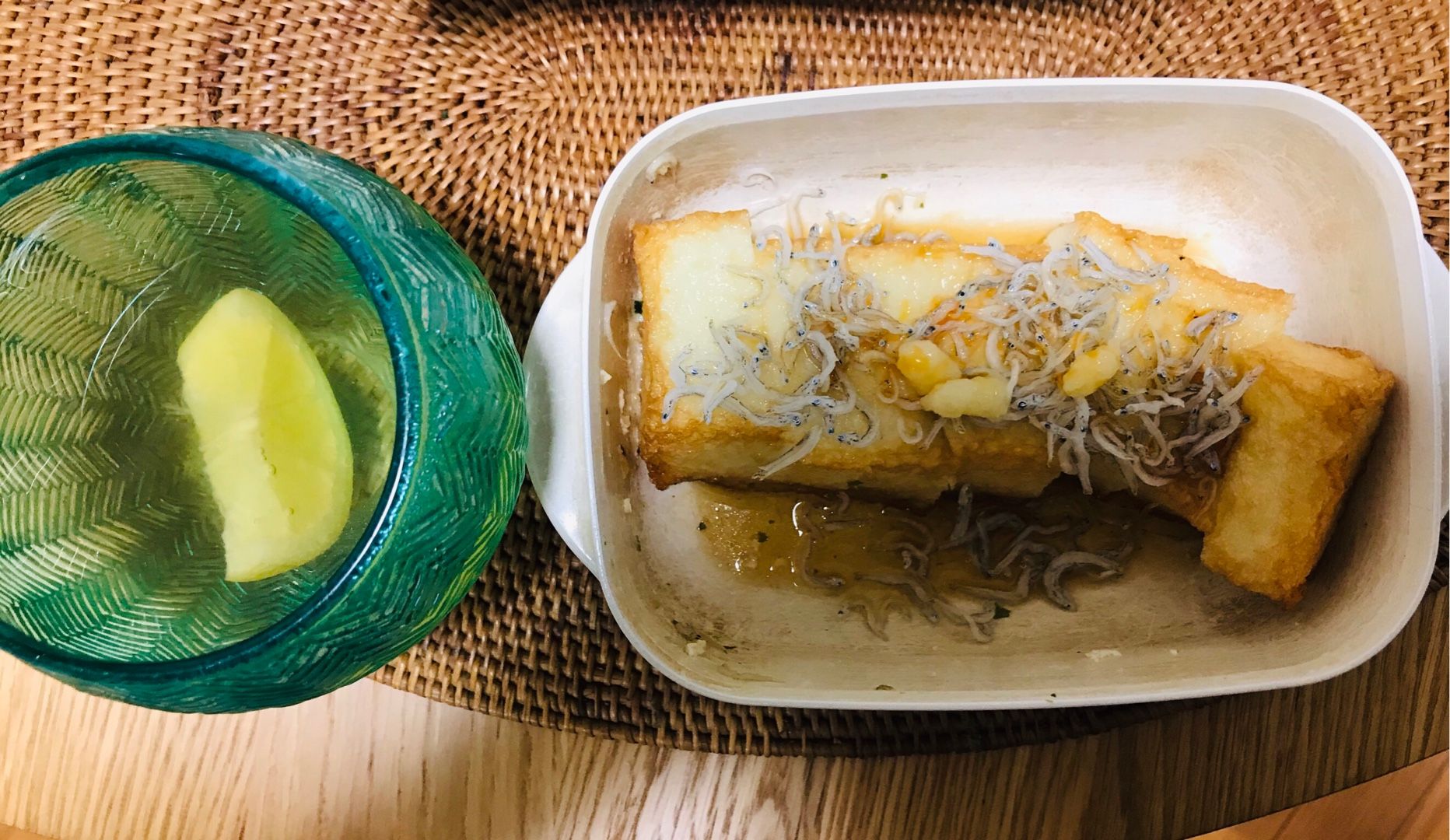 しらすとニンニクをトッピングした揚げ出しとうふと
