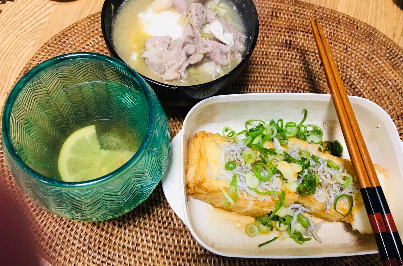 しらすと細ねぎとニンニクをトッピングした揚げ出し豆腐、