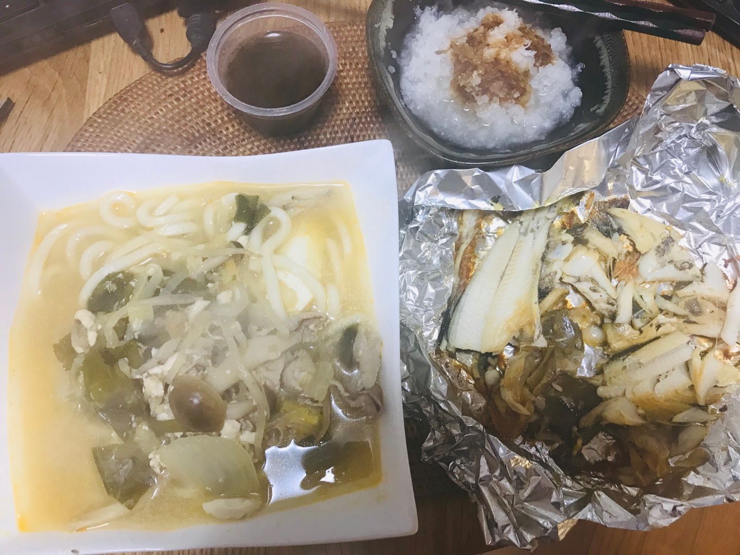 ​水曜日の朝食は、卵🥚入り煮込みうどん、ホッケのホイル焼き、