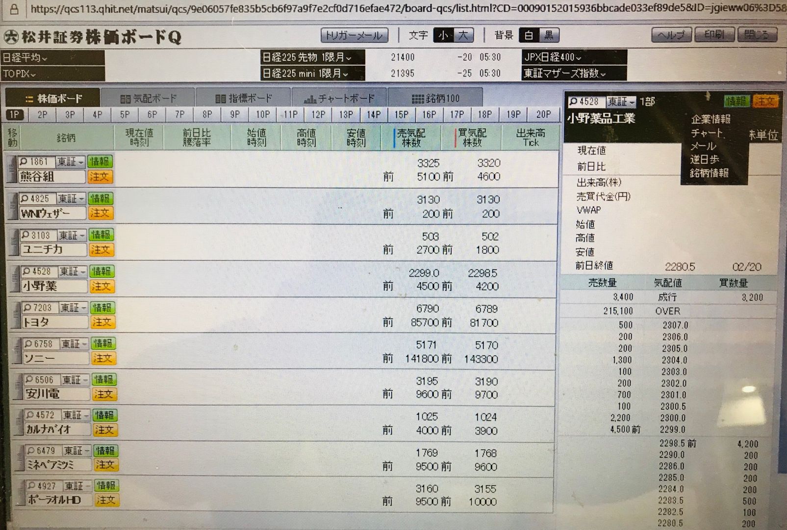 パソコンの画面は、松井証券の株価ボードを見ています。