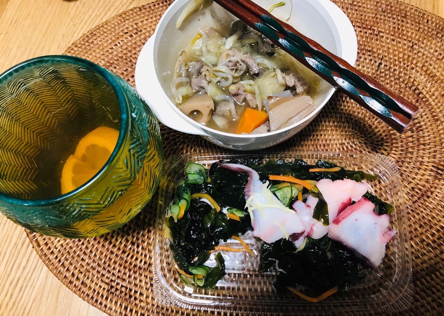 ​木曜日の家呑みは、筑前煮、タコとワカメの酢の物、卵🥚入り豚汁、