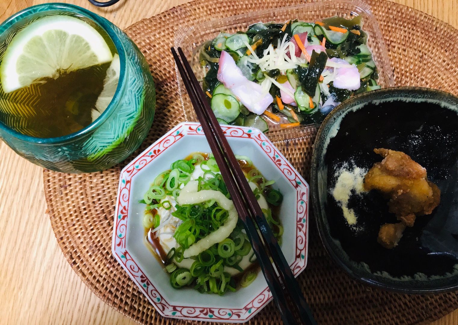 ​水曜日の家呑みは、筑前煮、タコとワカメの酢の物、唐揚げ、