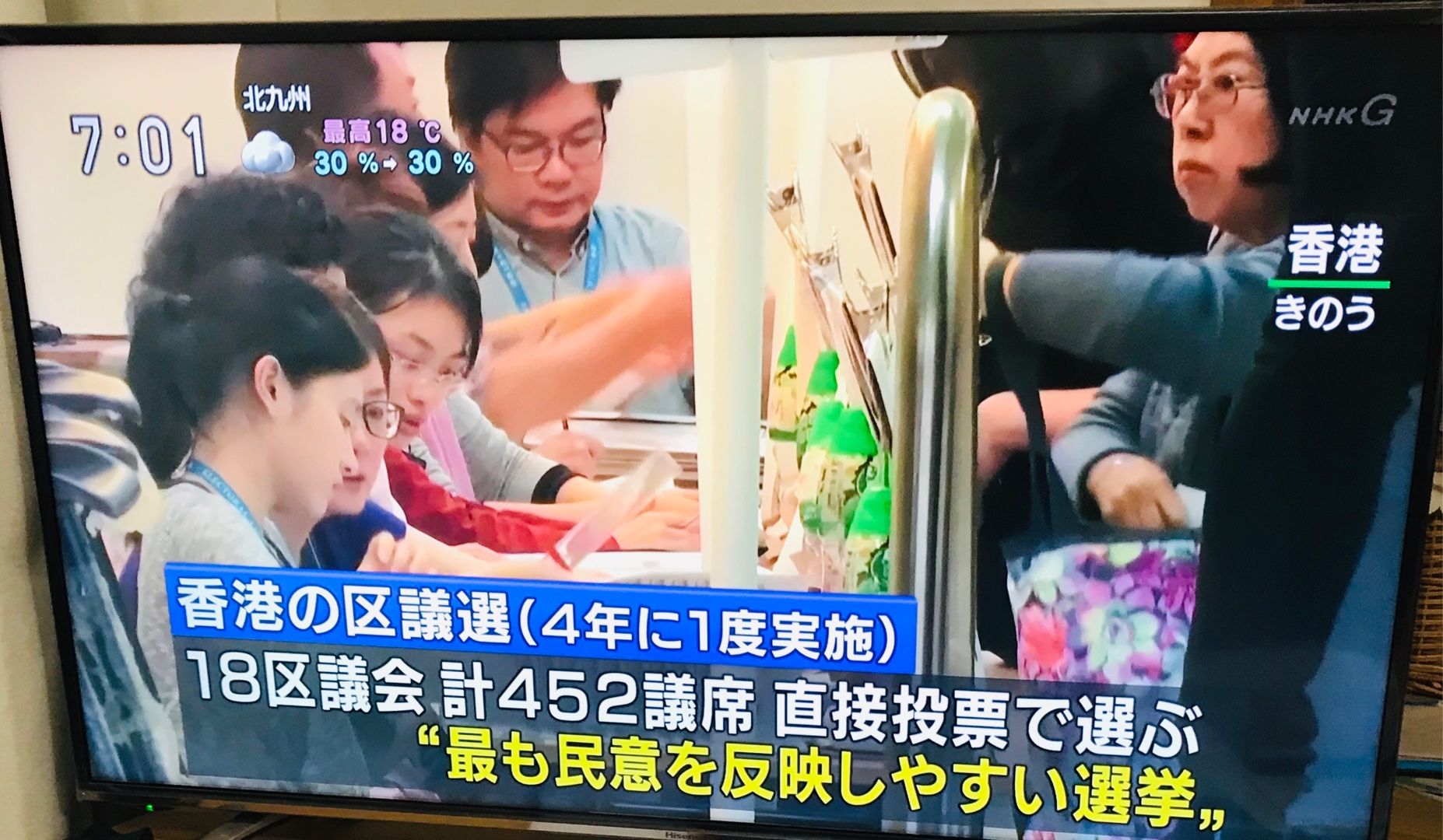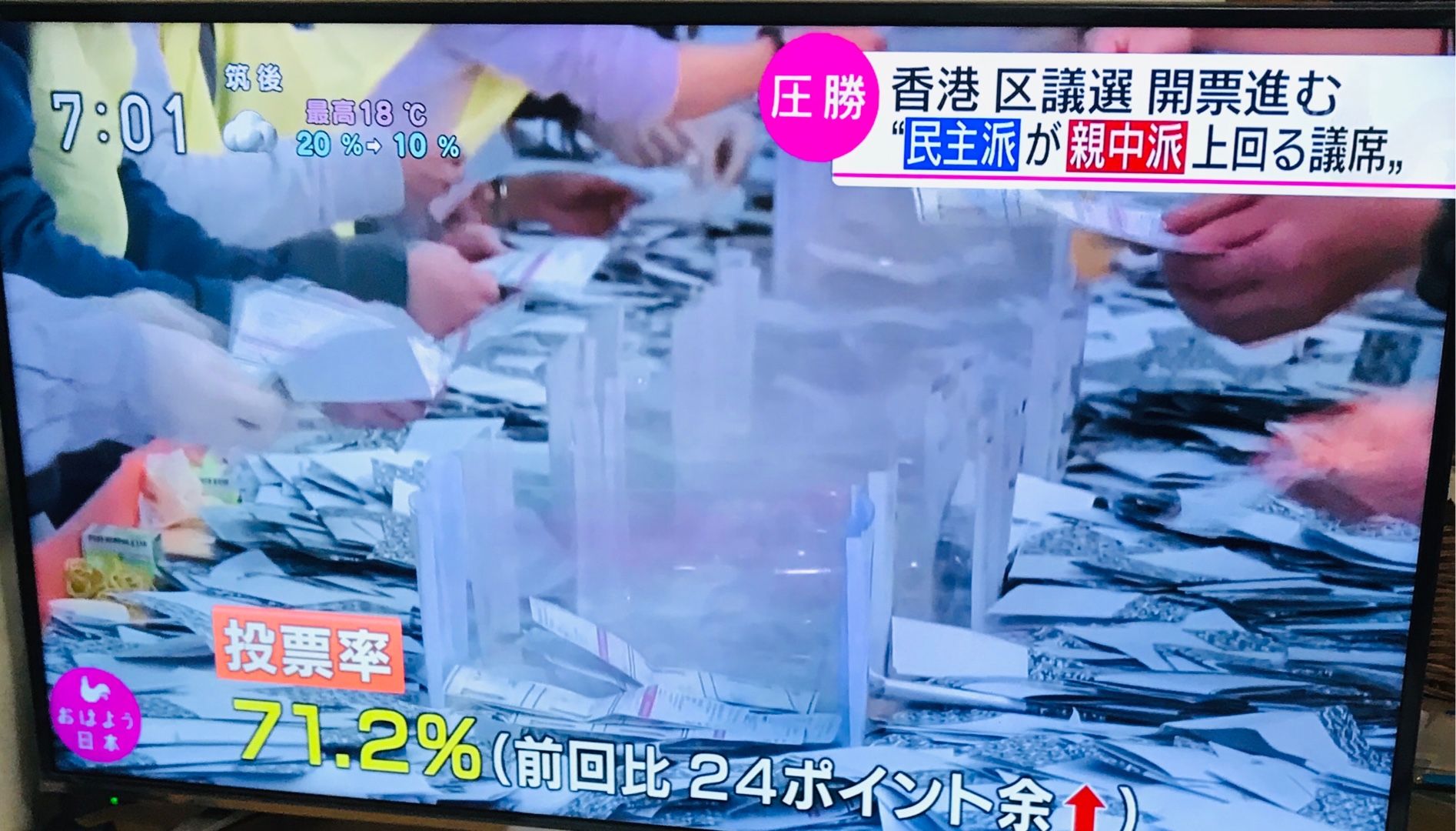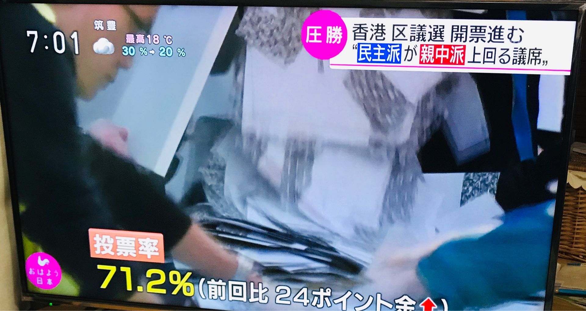​昨日の香港区議会選挙の25日未明の中間集計で、民主派が親中派に圧勝。