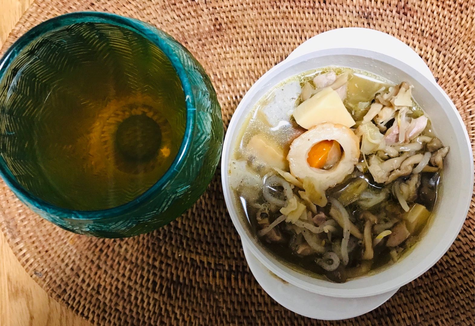 トッピングした絹揚げ豆腐、野菜スープ、酎ハイでした。