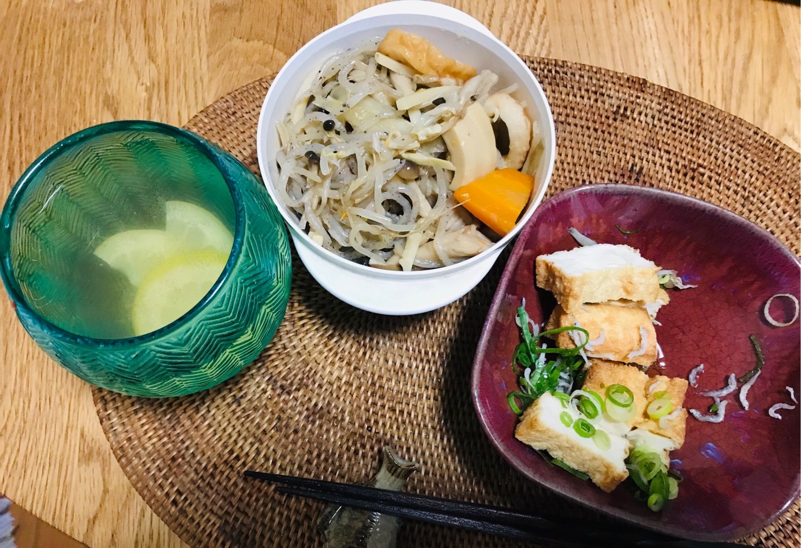 ちりめんと細ねぎとアマニ油をトッピングした絹揚げ豆腐、