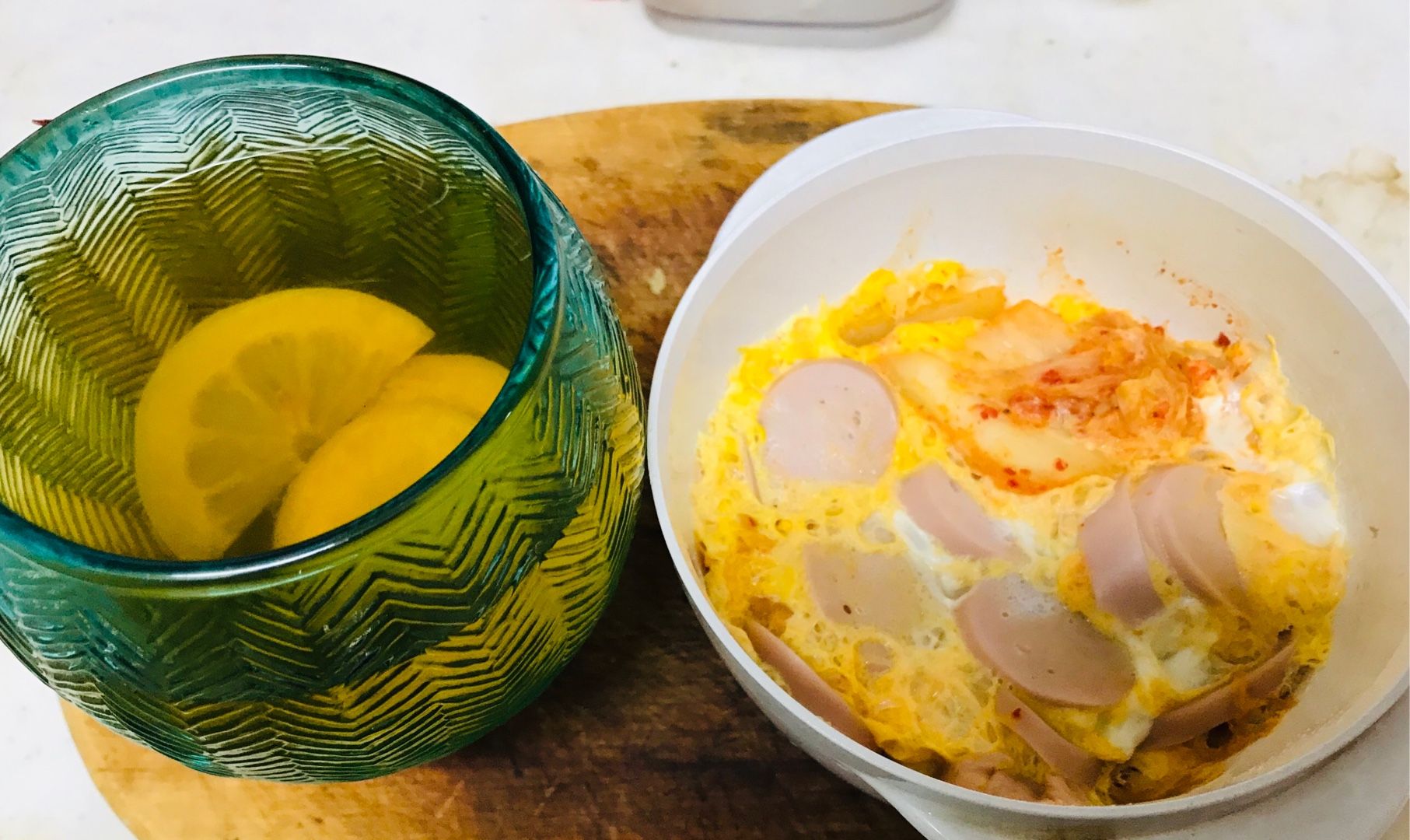 最後に、魚肉ソーセージと白菜キムチをトッピングした卵🥚焼きを