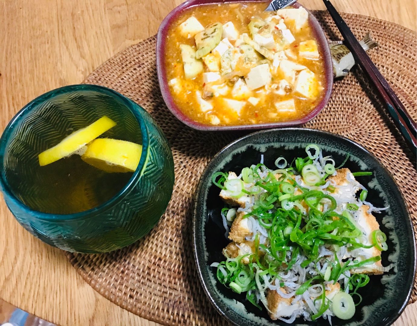 ちりめんと細ねぎとアマニ油をトッピングした絹揚げ豆腐を