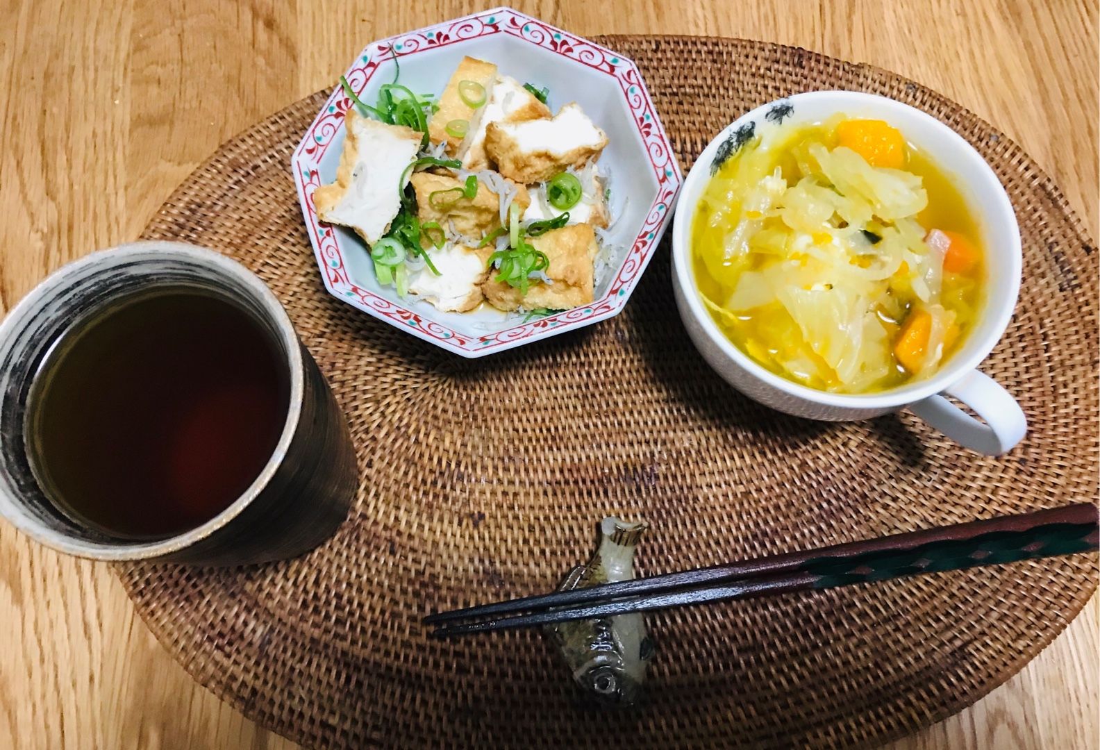 トッピングした絹揚げ豆腐、卵🥚と水餃子入り野菜スープ、