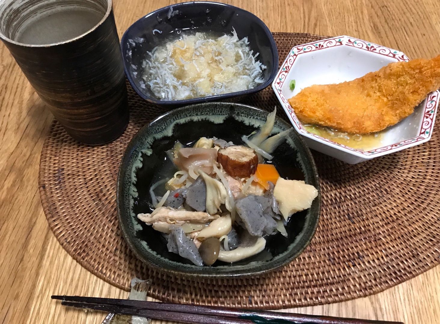 白身魚のフライを肴にごぼう茶割り芋焼酎を飲みます。