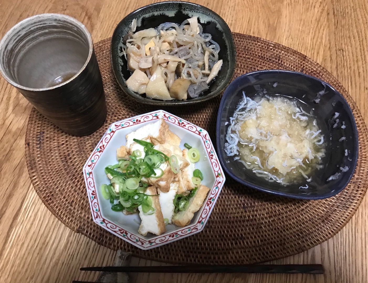 この後は、細ねぎとアマニ油をトッピングした絹揚げ豆腐、