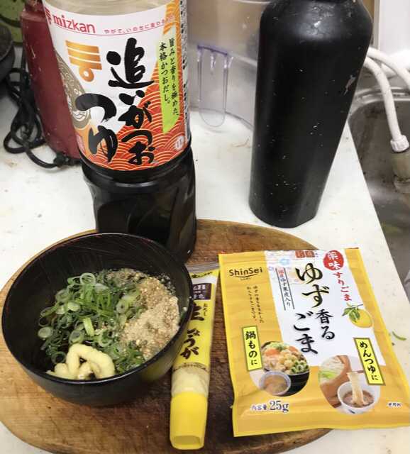 薬味は、細ネギとおろししょうが、ゆず香るごまを追いがつおつゆで